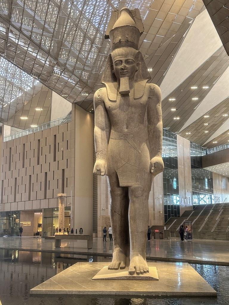 大埃及博物館蜿蜒于吉薩金字塔群側(cè)畔,場館將安置10萬余件埃及文物。從史前到希臘-羅馬時期,按年代順序陳列。其中最大的展品包括位于中庭的一尊高11米、重75噸的拉美西斯大帝紅色花崗巖雕像和一艘45米長的木制“太陽船”,該船于1954年從胡夫金字塔底部坑穴發(fā)掘出土。