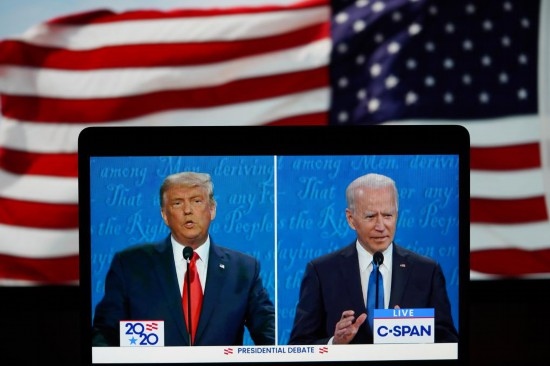這張2020年10月22日在美國(guó)弗吉尼亞州阿靈頓拍攝的視頻畫面顯示,時(shí)任美國(guó)總統(tǒng)特朗普(左)與民主黨總統(tǒng)候選人拜登在田納西州納什維爾市參加最后一場(chǎng)總統(tǒng)候選人電視辯論。新華社記者劉杰攝