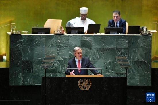 9月24日,在位于紐約的聯(lián)合國(guó)總部,聯(lián)合國(guó)秘書長(zhǎng)古特雷斯(前)在第79屆聯(lián)合國(guó)大會(huì)一般性辯論開(kāi)幕式上致辭。新華社記者 李睿 攝