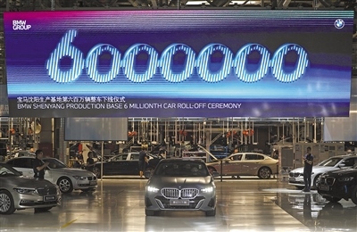 遼寧沈陽市的華晨寶馬汽車有限公司大東工廠,在華晨寶馬第600萬輛整車下線儀式現(xiàn)場,電子大屏幕上“6000000”字樣不停閃爍。新華社記者 潘昱龍攝