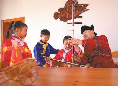 哈拉新村村民在教當?shù)睾⒆友葑鄠鹘y(tǒng)樂器。齊齊哈爾大學孟加拉國籍留學生 衣睿實攝“在哈拉新村,我看到四弦琴造型的村口大門、魚叉狀的路燈,還有整整齊齊的‘介字房’……這里獨特的民族文化、濃郁的鄉(xiāng)土風情,給我留下了深刻印象。當?shù)丶缺A魝鹘y(tǒng)的達斡爾族人文特征,又開發(fā)文化體驗館、民族特色美食等現(xiàn)代旅游資源,重視文化保護和傳承的做法值得借鑒。”