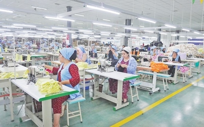 中泰新絲路塔吉克斯坦農(nóng)業(yè)紡織產(chǎn)業(yè)園成衣車間的工人們正在制作服裝。本報(bào)記者 曲 頌攝
