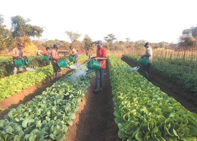 剛果(金)農業(yè)種植培訓示范基地的當?shù)貙W員在為蔬菜澆水。北方礦業(yè)拉米卡公司供圖