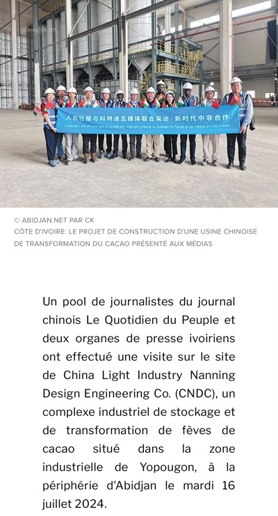 7月16日,人民日?qǐng)?bào)與兩家科特迪瓦新聞機(jī)構(gòu)記者一行參觀(guān)了由中國(guó)輕工業(yè)南寧設(shè)計(jì)工程有限公司總承包的可可加工及可可豆倉(cāng)庫(kù)建設(shè)項(xiàng)目,該項(xiàng)目坐落在阿比讓郊區(qū)的約普貢工業(yè)區(qū)。該公司負(fù)責(zé)人指出,該項(xiàng)目綜合體計(jì)劃于2024年年底完工,包括一個(gè)可加工5萬(wàn)噸可可豆的工廠(chǎng)、可存儲(chǔ)14萬(wàn)噸可可豆的倉(cāng)庫(kù)以及培訓(xùn)中心、行政大樓等?!钥铺氐贤甙⒈茸尵W(wǎng)報(bào)道
