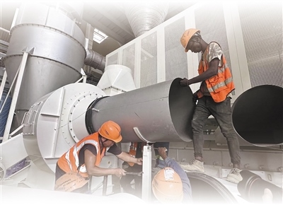 在科特迪瓦阿比讓可可加工廠(chǎng)內(nèi),中科工作人員正在安裝調(diào)試設(shè)備。科特迪瓦阿比讓網(wǎng)記者 希普林·夸西攝