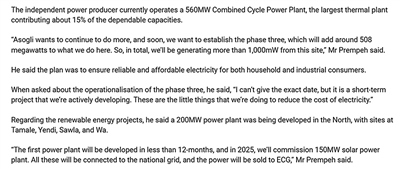 深能安所固投資建設(shè)運(yùn)營的聯(lián)合循環(huán)發(fā)電廠裝機(jī)容量560兆瓦,并計(jì)劃在未來通過擴(kuò)建工程提升至超1000兆瓦,為當(dāng)?shù)丶彝ズ凸I(yè)消費(fèi)者提供可靠且負(fù)擔(dān)得起的電力供應(yīng)。加中兩國員工在電廠運(yùn)營中密切合作,新入職的加納員工會配有一名中國導(dǎo)師,還可以通過參加培訓(xùn)提升職業(yè)技能?!约蛹{通訊社報(bào)道