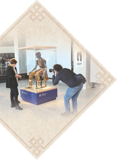 加入科研團(tuán)隊(duì)的德國服裝設(shè)計(jì)師卡特琳·迪爾斯娜第一次接觸古代服飾文物,但多年來為歷史題材電影和戲劇制作服飾的經(jīng)驗(yàn)對(duì)她很有幫助。此次全套服裝包括素絹高領(lǐng)短衫、粉色拼接藍(lán)色羊毛束口長褲、與長褲同色系的羊毛短靴(靴口為素絹)、素色絲質(zhì)裹身半裙、裝飾與配色同樣考究的套頭長袍,以及下緣綴有風(fēng)琴褶的淺金拼淡玫紅色絲質(zhì)大衣——經(jīng)過科學(xué)復(fù)原,古代服飾的時(shí)尚審美與紡織技藝令人嘆服,衣物主人的綽約風(fēng)姿也穿越千年風(fēng)沙,宛在眼前?!翱吹竭@些服裝一件件穿在真人模特身上,完美地隨身搖擺,我被深深打動(dòng)。那一刻,我和2000多年前的人與物情感相連,感受相通?!钡蠣査鼓日f。