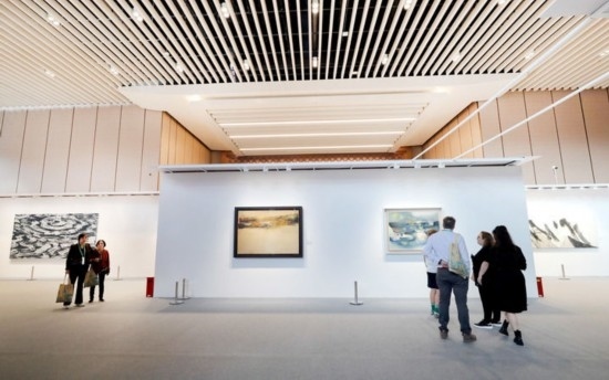 11月9日,觀眾在第七屆進(jìn)博會(huì)國際現(xiàn)當(dāng)代藝術(shù)專區(qū)觀看繪畫藝術(shù)展品。新華社記者 方喆 攝
