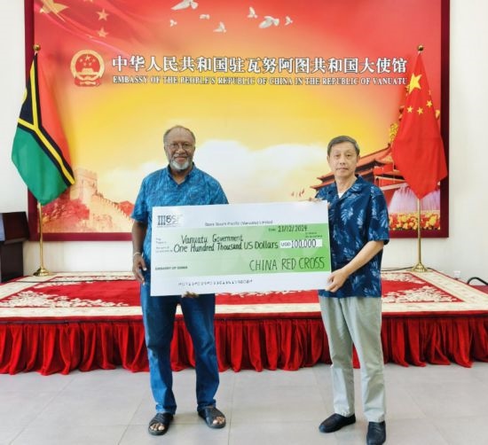 12月21日,中國駐瓦努阿圖大使李名剛(右)向瓦看守政府總理薩爾維轉交中國紅十字會向瓦提供的10萬美元緊急人道主義現(xiàn)匯援助。中國駐瓦努阿圖大使館供圖