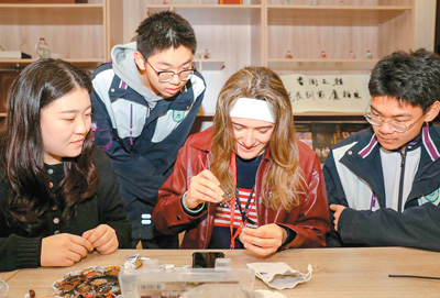 在學(xué)校藝術(shù)中心、體育中心和學(xué)生發(fā)展中心,美國青少年體驗了衡水中學(xué)學(xué)生豐富的課余生活。小小的玻璃壺坯內(nèi),手繪細(xì)膩的內(nèi)畫;一張?zhí)镒指裥埳?,學(xué)寫毛筆書法;面塑課堂上,彩色面團(tuán)捏出多般造型;乒乓球桌上,與中國學(xué)生展開球技對壘……一堂堂社團(tuán)課程,讓美國青少年近距離感知立體、生動的中國教育。