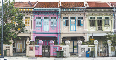 初至新加坡,我用腳步丈量這個(gè)國(guó)家,每一步都仿佛踩在歷史與現(xiàn)實(shí)的交匯點(diǎn)上。行至加?xùn)|街區(qū)的如切路,仿佛走進(jìn)時(shí)光的萬(wàn)花筒,瞬間被頗具歷史感的娘惹建筑環(huán)繞。街道兩旁,色彩斑斕的娘惹排屋(見圖,約翰·西頓·卡拉漢攝,影像中國(guó))如同一幅幅鋪開的絢麗油畫:中式飛檐與歐式廊柱巧妙融為一體;門窗上的雕花精致細(xì)膩,盡顯龍鳳等中國(guó)圖案的吉祥寓意、棕櫚紋等馬來(lái)元素的自然之美和歐洲巴洛克風(fēng)格的華麗細(xì)節(jié);彩色玻璃在陽(yáng)光下折射出五彩斑斕的光澤;繁復(fù)的花卉瓷磚如華麗織錦,讓人目不暇接……一步一景,皆散發(fā)著濃郁的南洋風(fēng)情,好似輕吟淺唱一曲悠遠(yuǎn)的歲月之歌。