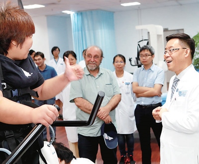 尼科萊利斯(中)與醫(yī)務(wù)人員共同指導(dǎo)截癱患者使用外骨骼康復(fù)機器人進行步行訓(xùn)練。