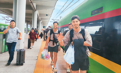 外國旅客乘坐中老鐵路跨境旅客列車抵達(dá)云南磨憨站。