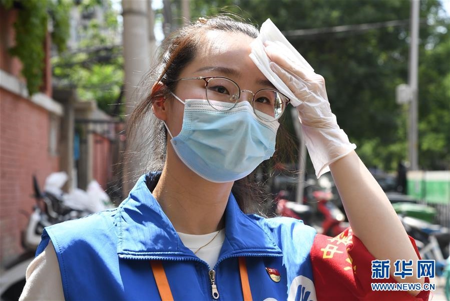 6月16日,在北京市海淀區(qū)中關(guān)村街道白塔庵社區(qū)出入口,疫情防控志愿者王玥在擦拭汗水。連日來,北京出現(xiàn)高溫天氣。酷暑中,工作人員堅(jiān)守抗擊疫情一線,成為烈日下的“逆行者”。新華社記者任超攝