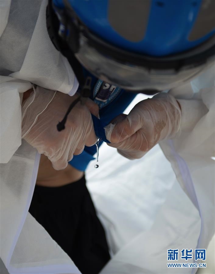 6月16日,北京藍(lán)天救援隊(duì)完成消殺任務(wù)后,一位隊(duì)員的衣服被擰出了汗水。連日來,北京出現(xiàn)高溫天氣??崾钪?,工作人員堅(jiān)守抗擊疫情一線,成為烈日下的“逆行者”。新華社發(fā)(陳鐘昊攝)