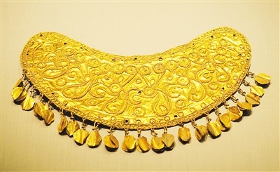 展廳里有不少光彩照人的漢代金飾品,體現(xiàn)了多元文明的融匯。一套出土于鄂爾多斯的金鑲貝玉首飾,由長方形鹿紋金飾牌、方形嵌蚌金串飾、包金玉佩等組成,其中的鹿紋是典型的草原風(fēng)格紋飾,嵌蚌及其周圍的連珠紋工藝則具有波斯等西方文明的工藝特征。一塊出土于通遼的金飾牌,是薩滿主持祭祀活動(dòng)時(shí)佩戴的飾件,中間雕有一高鼻深目、頭戴尖頂帽的女性,兩側(cè)各有一只怪獸,與西伯利亞地區(qū)出土的雙獅守護(hù)圣樹金飾牌極為相似。