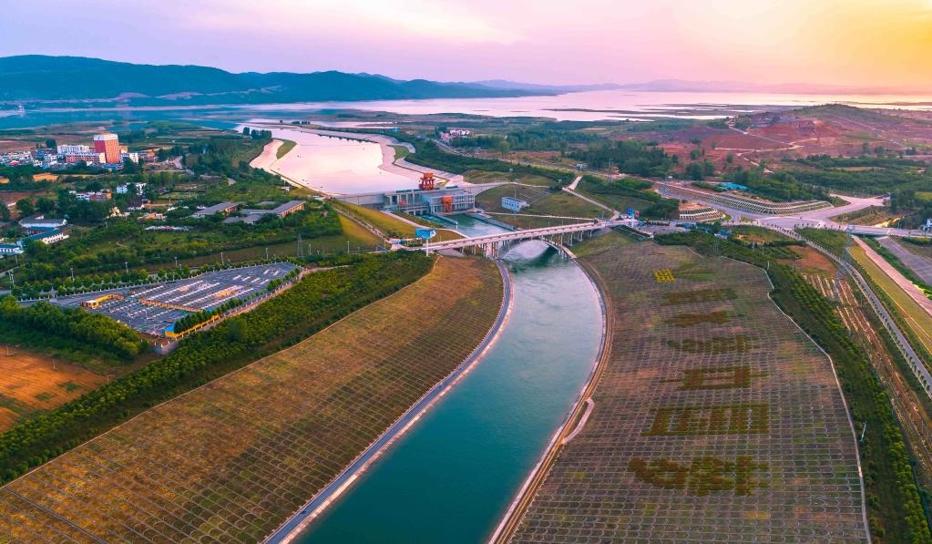 圖為南水北調中線工程陶岔渠首,上游通過引水渠與丹江口水庫相連,下游與南水北調中線干渠連接。