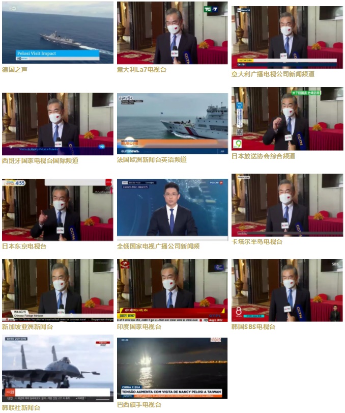 總臺國際視頻通訊社聚焦外交部、國臺辦、東部戰(zhàn)區(qū)等權(quán)威表態(tài),可視化制作編發(fā)《國際銳評》《玉淵譚天》等相關(guān)評論言論。截至8月4日10時,共有84條新聞素材得到BBC、CNN、CNBC、英國天空新聞臺、法國24臺、法國電視臺、法國新聞臺、德國電視一臺、德國電視二臺、德國之聲、意大利廣播電視公司、意大利TGCOM24電視臺、加拿大廣播公司、加拿大最大的商業(yè)電視網(wǎng)CTV、俄羅斯第一頻道、全俄國家電視廣播公司、日本NHK、韓國KBS、巴西環(huán)球電視臺、印度國家電視臺、新加坡亞洲新聞臺、澳大利亞廣播公司、卡塔爾半島電視臺、墨西哥阿茲特克電視臺、印尼國家廣播電視臺等102個國家和地區(qū)的1683個電視臺及新媒體平臺采用。國際視頻通訊社還特別面向中國臺灣地區(qū)的媒體進行精準投送,實現(xiàn)臺灣地區(qū)主流電視臺全覆蓋,落地效果突出:臺灣東森電視臺、臺灣無線衛(wèi)星電視臺(TVBS)、臺灣中華電視臺、臺灣中天電視臺等共有13個臺灣電視臺及采用播出744次,播出總時長3小時26分44秒。