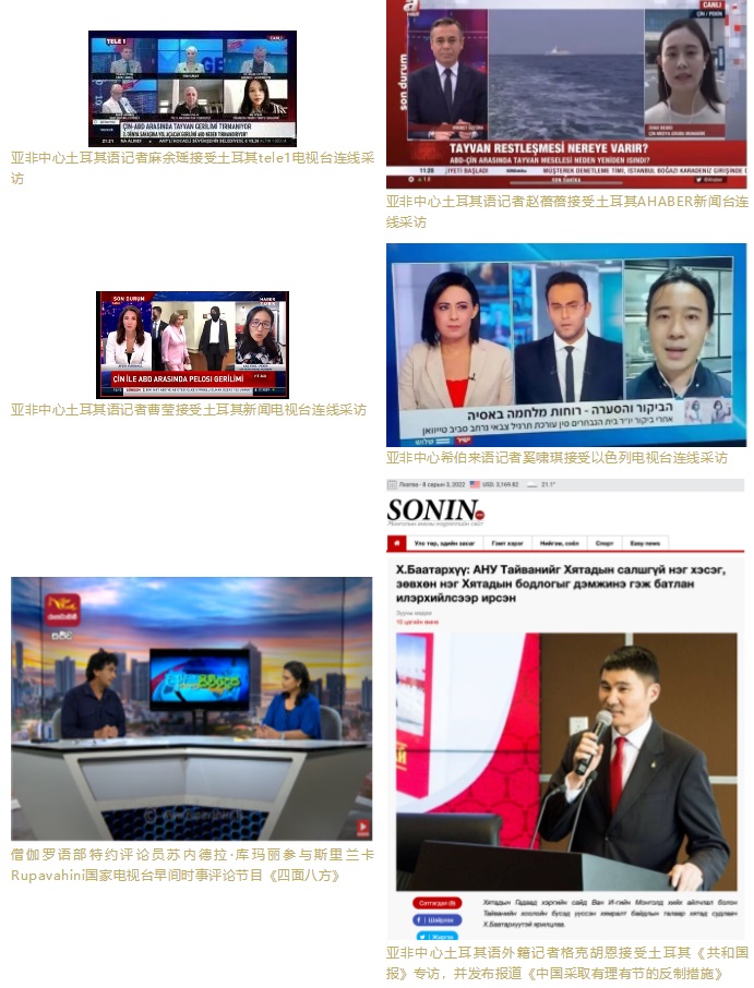 亞非中心土耳其、希伯來語、豪薩語、尼泊爾語、蒙古語等多語種主播、評論員和網(wǎng)紅積極在多家外媒發(fā)聲,接受了包括以色列電視臺、土耳其AHABER新聞臺、土耳其TGRT電視臺、土耳其新聞電視臺等多家國際媒體的采訪連線,同時多名外籍記者、海外特約評論員在尼日利亞《領導者報》網(wǎng)站、尼泊爾《光線新聞網(wǎng)》、肯尼亞《人民報》、蒙古國媒體SONIN.MN等對象國主流媒體發(fā)表評論及署名文章,對外闡釋中方立場和反制措施的合理性、正當性,介紹臺灣問題歷史經(jīng)緯,揭批美國在臺灣問題上的背信棄義。