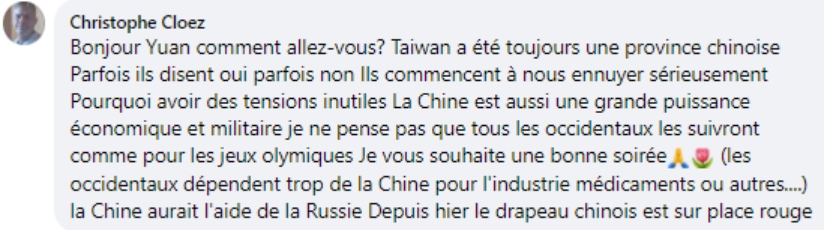 法語網(wǎng)友克羅茲:“臺灣始終是中國的一個省,美國人一會兒承認一會兒又不承認,現(xiàn)在他們又開始搗亂。為什么要制造這種毫無意義的緊張氣氛呢?中國是一個經(jīng)濟和軍事大國,我不認為西方會跟著美國走,就像之前的奧運會一樣,西方國家太依賴于中國工業(yè)了。俄羅斯應該是支持中國的吧,昨天紅場上方都飄著中國國旗?!?/p>