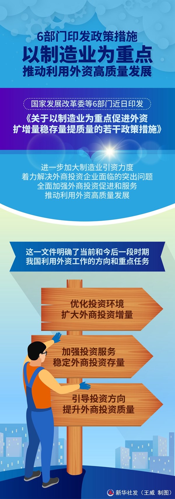 新華社北京10月25日電(記者安蓓)記者25日了解到,國(guó)家發(fā)展改革委等6部門近日印發(fā)《關(guān)于以制造業(yè)為重點(diǎn)促進(jìn)外資擴(kuò)增量穩(wěn)存量提質(zhì)量的若干政策措施》,進(jìn)一步加大制造業(yè)引資力度,著力解決外商投資企業(yè)面臨的突出問(wèn)題,全面加強(qiáng)外商投資促進(jìn)和服務(wù),推動(dòng)利用外資高質(zhì)量發(fā)展。