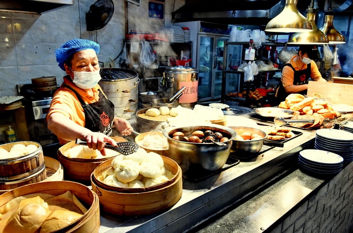 8月8日,福建省建甌市區(qū)一家美食店服務(wù)人員在擺放特色小吃。新華社記者林善傳攝