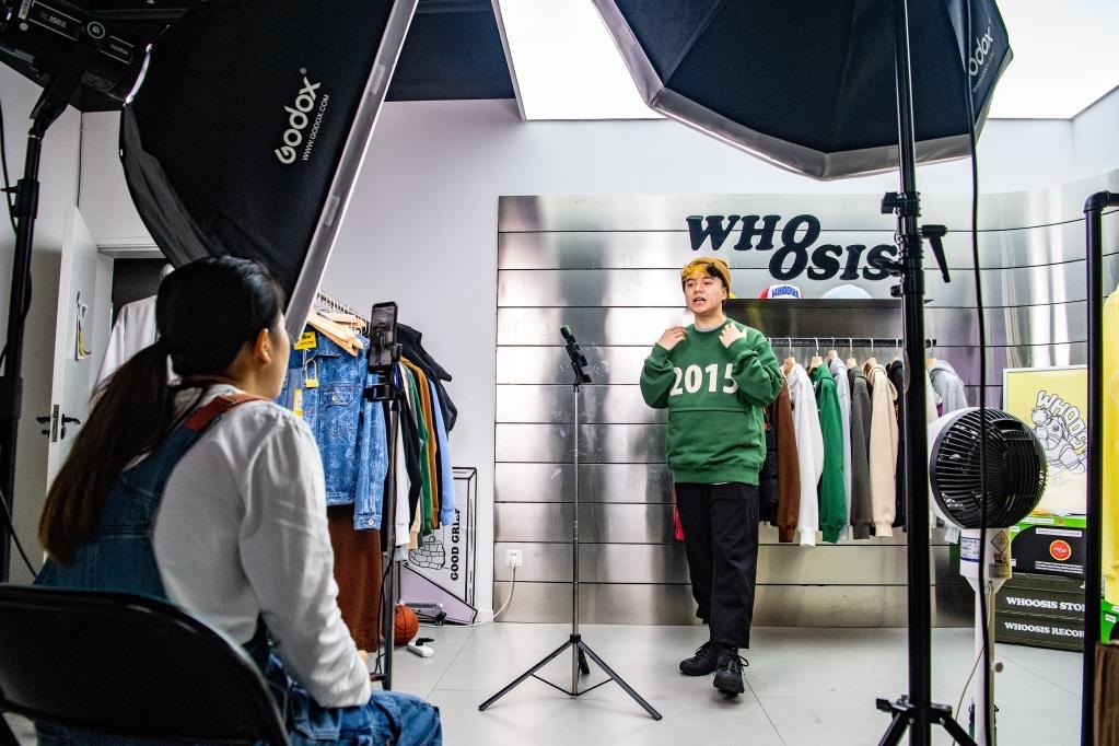 在重慶市渝中區(qū)由工業(yè)遺址改造成的“一廠影視園”一家國(guó)潮品牌公司內(nèi),創(chuàng)業(yè)者通過手機(jī)直播銷售商品(2022年9月27日攝)。新華社記者唐奕攝