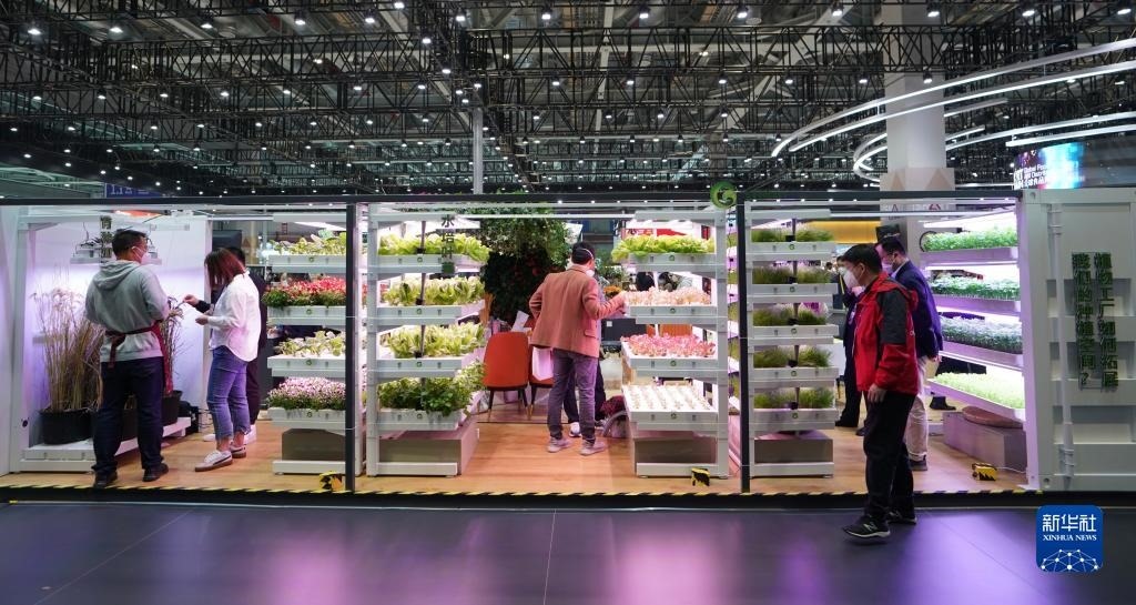 觀眾在第五屆進(jìn)博會(huì)食品及農(nóng)產(chǎn)品展區(qū)參觀集裝箱植物工廠的模型(2022年11月7日攝)。新華社記者 劉穎 攝