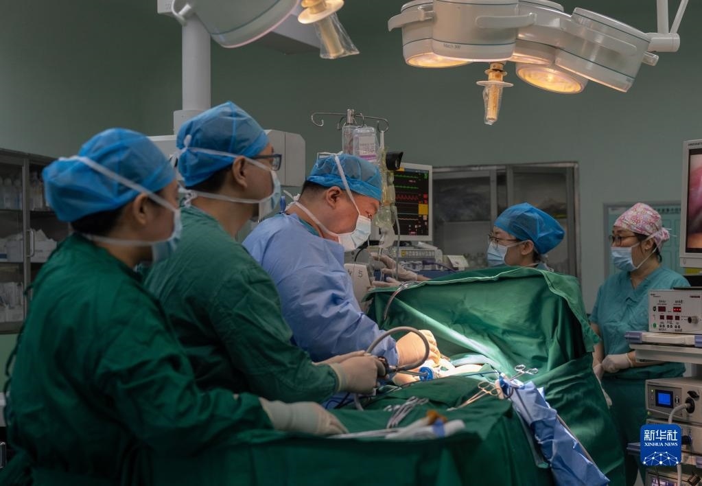 在北京市第六醫(yī)院的醫(yī)聯(lián)體胸外科病房手術(shù)室,北京協(xié)和醫(yī)院與北京市第六醫(yī)院的醫(yī)護(hù)人員進(jìn)行團(tuán)隊(duì)協(xié)作開(kāi)展胸腔鏡手術(shù)(2021年6月3日攝)。新華社記者 才揚(yáng) 攝