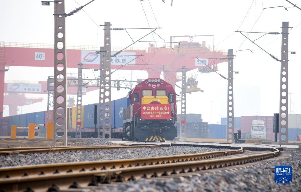 滿(mǎn)載日用百貨的X8151次中歐班列從西安國(guó)際港站駛出,開(kāi)往白俄羅斯首都明斯克(2023年2月1日攝)。新華社記者 李一博 攝
