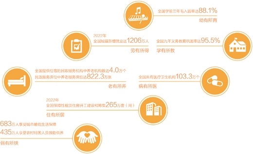 實(shí)實(shí)在在的舉措,帶來(lái)了實(shí)實(shí)在在的成效。城鄉(xiāng)學(xué)前教育公共服務(wù)體系基本建成,學(xué)前三年毛入園率由2011年的62.3%提高到2021年的88.1%。堅(jiān)持政府舉辦義務(wù)教育,九年義務(wù)教育鞏固率達(dá)95.5%,初中在校生5120.6萬(wàn)人,普通小學(xué)在校生10732.0萬(wàn)人;實(shí)施就業(yè)優(yōu)先戰(zhàn)略,確保就業(yè)局勢(shì)總體穩(wěn)定,2022年城鎮(zhèn)新增就業(yè)達(dá)1206萬(wàn)人,脫貧人口務(wù)工規(guī)模3278萬(wàn)人,100個(gè)城市公共就業(yè)服務(wù)機(jī)構(gòu)求人倍率為1.46,繼續(xù)保持在1以上,崗位供給大于求職人數(shù);著力解決群眾看病難、看病貴問(wèn)題,人民健康水平穩(wěn)步提升,全國(guó)共有醫(yī)療衛(wèi)生機(jī)構(gòu)103.3萬(wàn)個(gè),醫(yī)療衛(wèi)生機(jī)構(gòu)床位975萬(wàn)張,參加基本醫(yī)療保險(xiǎn)人數(shù)達(dá)到134570萬(wàn)人;不斷推進(jìn)養(yǎng)老事業(yè)和養(yǎng)老產(chǎn)業(yè)協(xié)同發(fā)展,養(yǎng)老服務(wù)體系更加健全,全國(guó)提供住宿的民政服務(wù)機(jī)構(gòu)中養(yǎng)老機(jī)構(gòu)達(dá)4.0萬(wàn)個(gè),民政服務(wù)床位中養(yǎng)老服務(wù)床位達(dá)822.3萬(wàn)張;加快推進(jìn)住房保障和供應(yīng)體系建設(shè),2022年全年全國(guó)各類棚戶區(qū)改造開(kāi)工134萬(wàn)套,基本建成181萬(wàn)套,全國(guó)保障性租賃住房開(kāi)工建設(shè)和籌集265萬(wàn)套(間),群眾居住條件不斷改善;扎實(shí)做好因疫因?yàn)?zāi)遇困群眾和老弱病殘等特殊群體的基本生活保障,2022年年末,683萬(wàn)人享受城市最低生活保障,435萬(wàn)人享受農(nóng)村特困人員救助供養(yǎng),全年臨時(shí)救助1083萬(wàn)人次,保障網(wǎng)越織越密實(shí)。