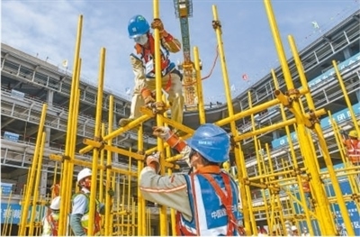 海南省建筑業(yè)職工職業(yè)技能競(jìng)賽暨質(zhì)量安全現(xiàn)場(chǎng)觀摩交流會(huì)現(xiàn)場(chǎng),建筑工人正在進(jìn)行架體搭設(shè)競(jìng)賽。康登淋攝(影像中國(guó))