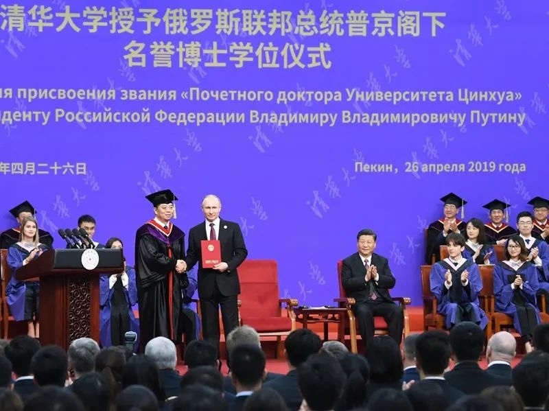 2019年4月,普京總統(tǒng)率團來華,出席第二屆“一帶一路”國際合作高峰論壇。期間,在北京友誼賓館,中方還有一項特殊安排:清華大學向普京總統(tǒng)授予名譽博士學位。
