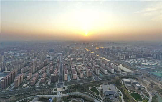3月31日在雄安新區(qū)拍攝的日出(無人機(jī)照片)。