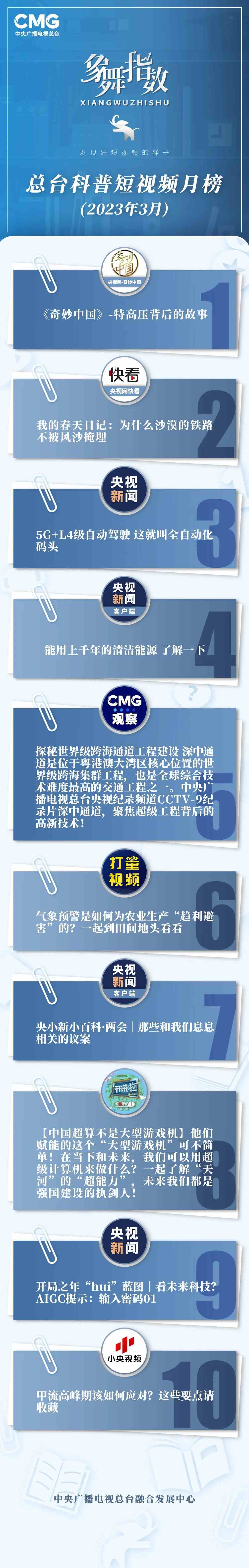中央廣播電視總臺“象舞指數(shù)”評議品牌,推出科普短視頻月榜、總臺科普短視頻月榜。在2023年3月,值得注目的內(nèi)容有: