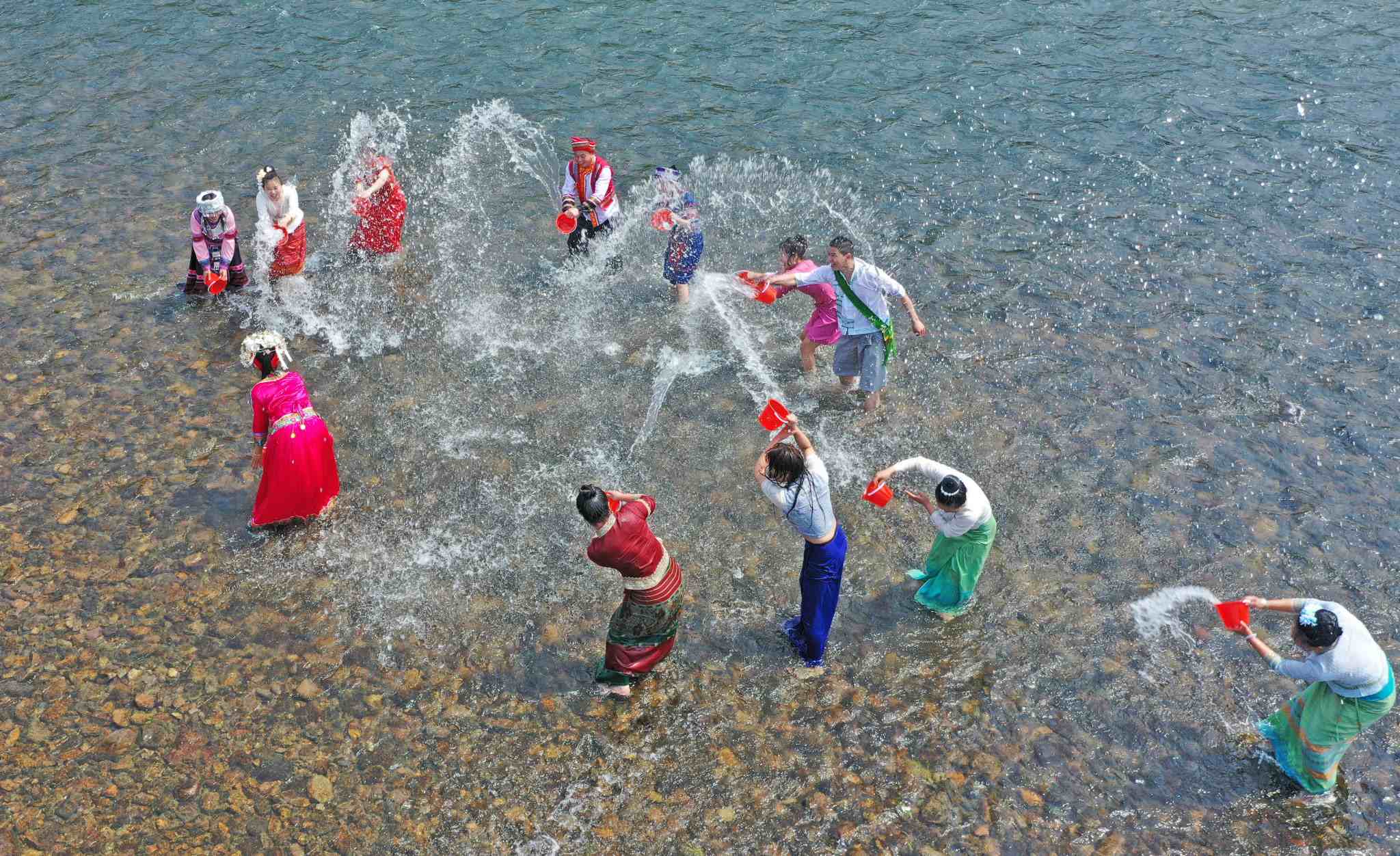 2023年4月12日,浙江臺(tái)州,仙居縣永安溪畔,傣族同胞正在參加潑水狂歡活動(dòng)。視覺(jué)中國(guó)