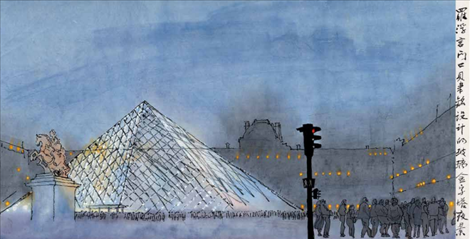 羅浮宮門(mén)口貝聿銘設(shè)計(jì)的玻璃金字塔夜景 35cm×68cm 1993 年