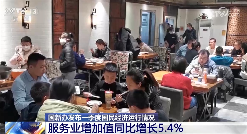 服務(wù)業(yè)增速明顯回升。一季度,服務(wù)業(yè)增加值同比增長5.4%,高于上年四季度3.1個百分點。前期受疫情影響較大的接觸型、聚集型服務(wù)業(yè)回升尤為突出。