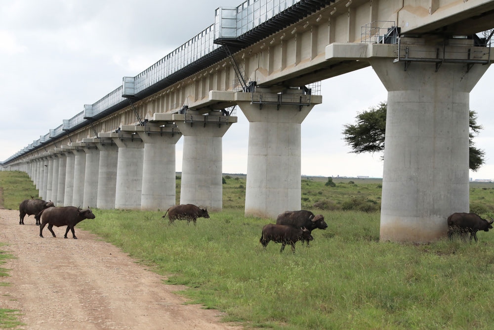 水牛在裝有聲屏障的肯尼亞內(nèi)羅畢國家公園特大橋下穿行(2021年5月19日攝)。中非共建的肯尼亞內(nèi)馬鐵路采用特大橋全程穿越內(nèi)羅畢國家公園方案,橋墩超過6米,讓長(zhǎng)頸鹿也能“昂首通過”;特大橋護(hù)欄兩側(cè)安裝聲屏障,極大降低火車通過時(shí)的噪音。