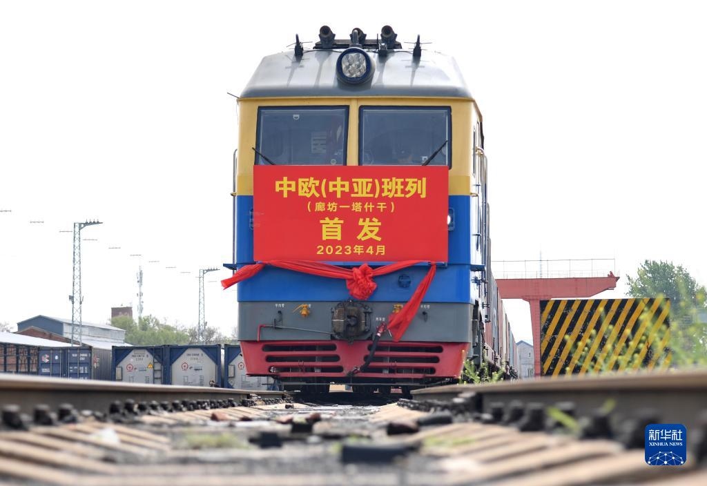 當日,河北省廊坊市正式開通中歐(中亞)班列(廊坊——塔什干)。首列開行的集裝箱班列編組55輛,由廊坊北鐵路貨場始發(fā),經(jīng)霍爾果斯口岸出境,途經(jīng)哈薩克斯坦,最終抵達烏茲別克斯坦塔什干,全程約6000公里,預計運行時間約15天,貨物總重量1400余噸,主要包括保溫管、機械設備、型材等。新華社發(fā)(劉向攝)