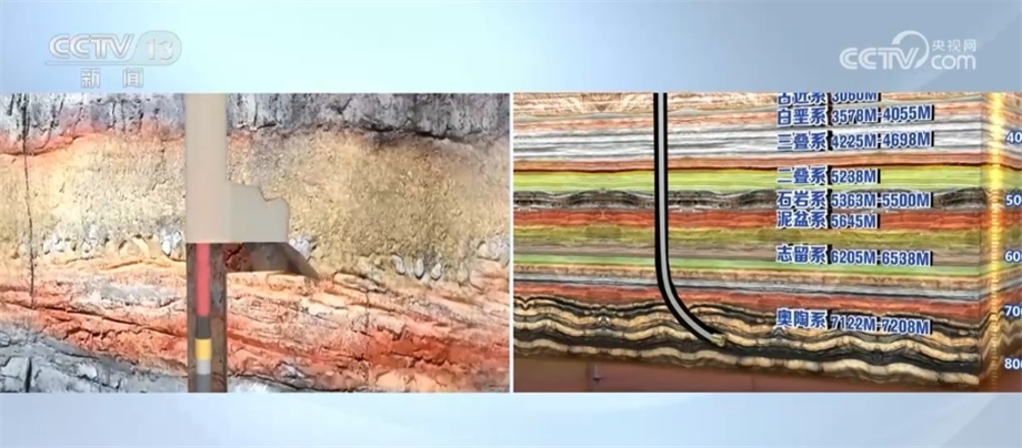 為了讓大家更好地理解鉆井工作,我們借助虛擬技術(shù)制作了一個地層結(jié)構(gòu)圖。開鉆施工后,將從新近系開始,陸續(xù)穿越古近系、白堊系、三疊系等,最后到達(dá)奧陶系,總共要經(jīng)過9個地層,最后來到9472米的油層深處。
