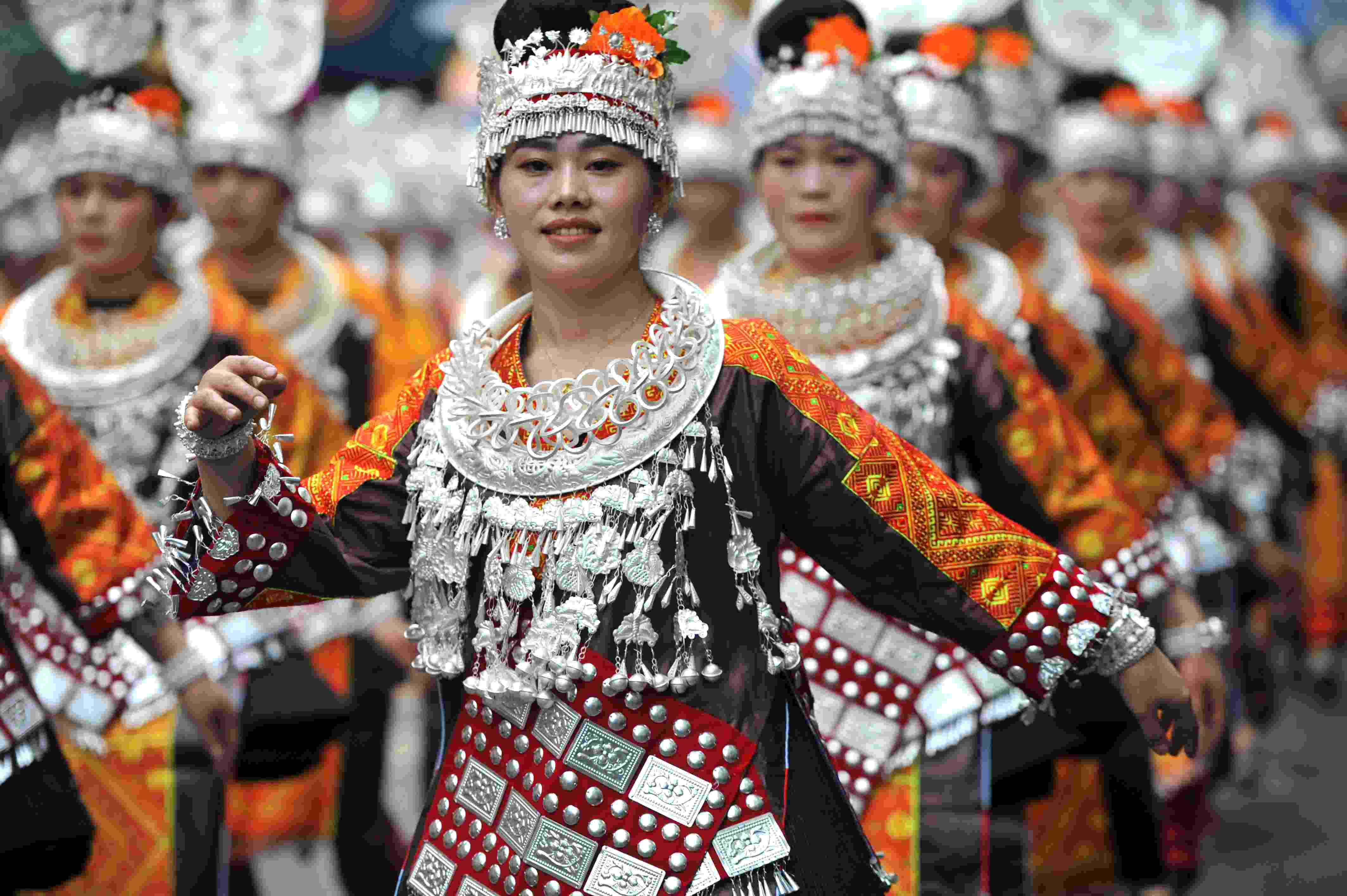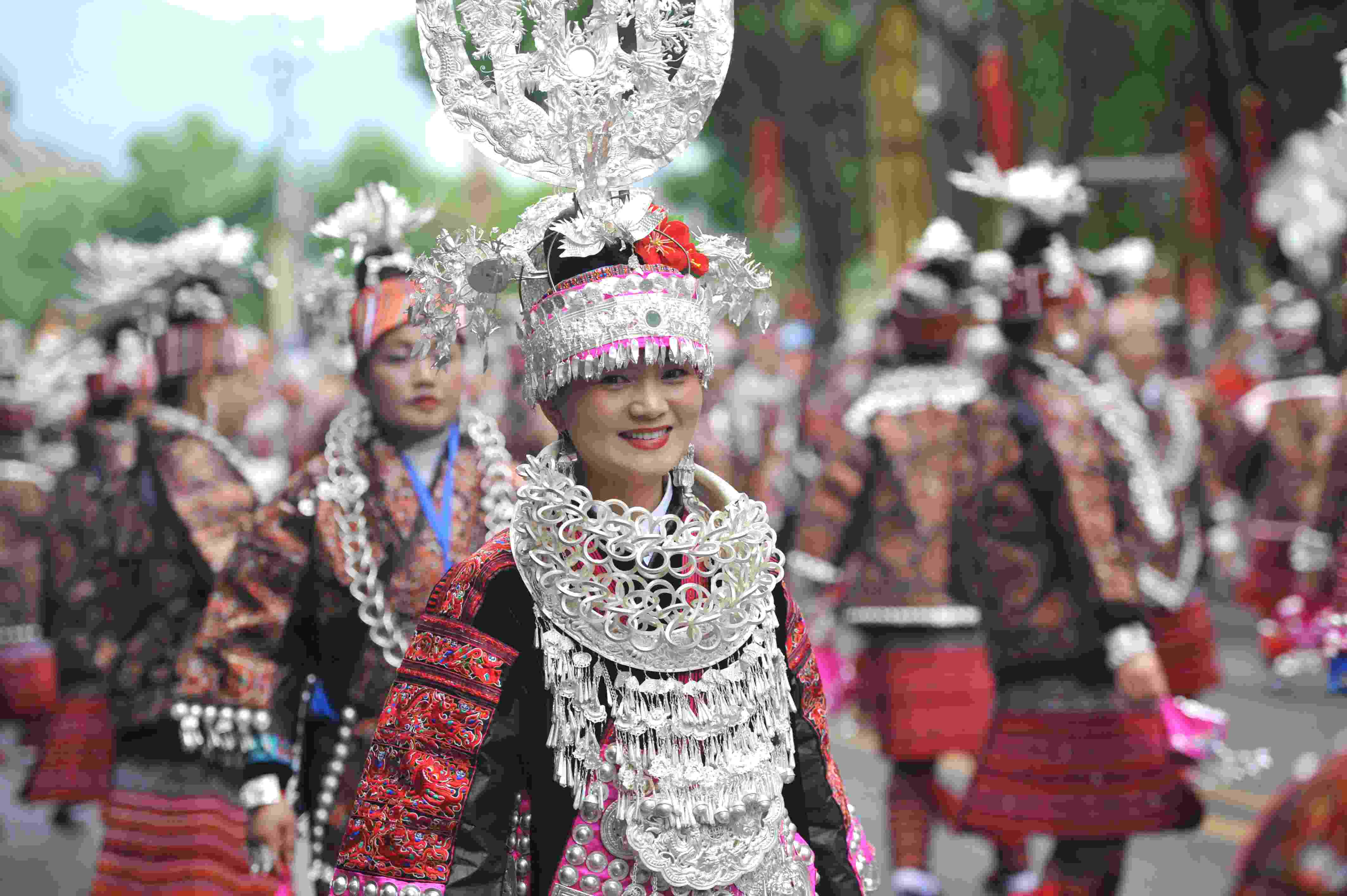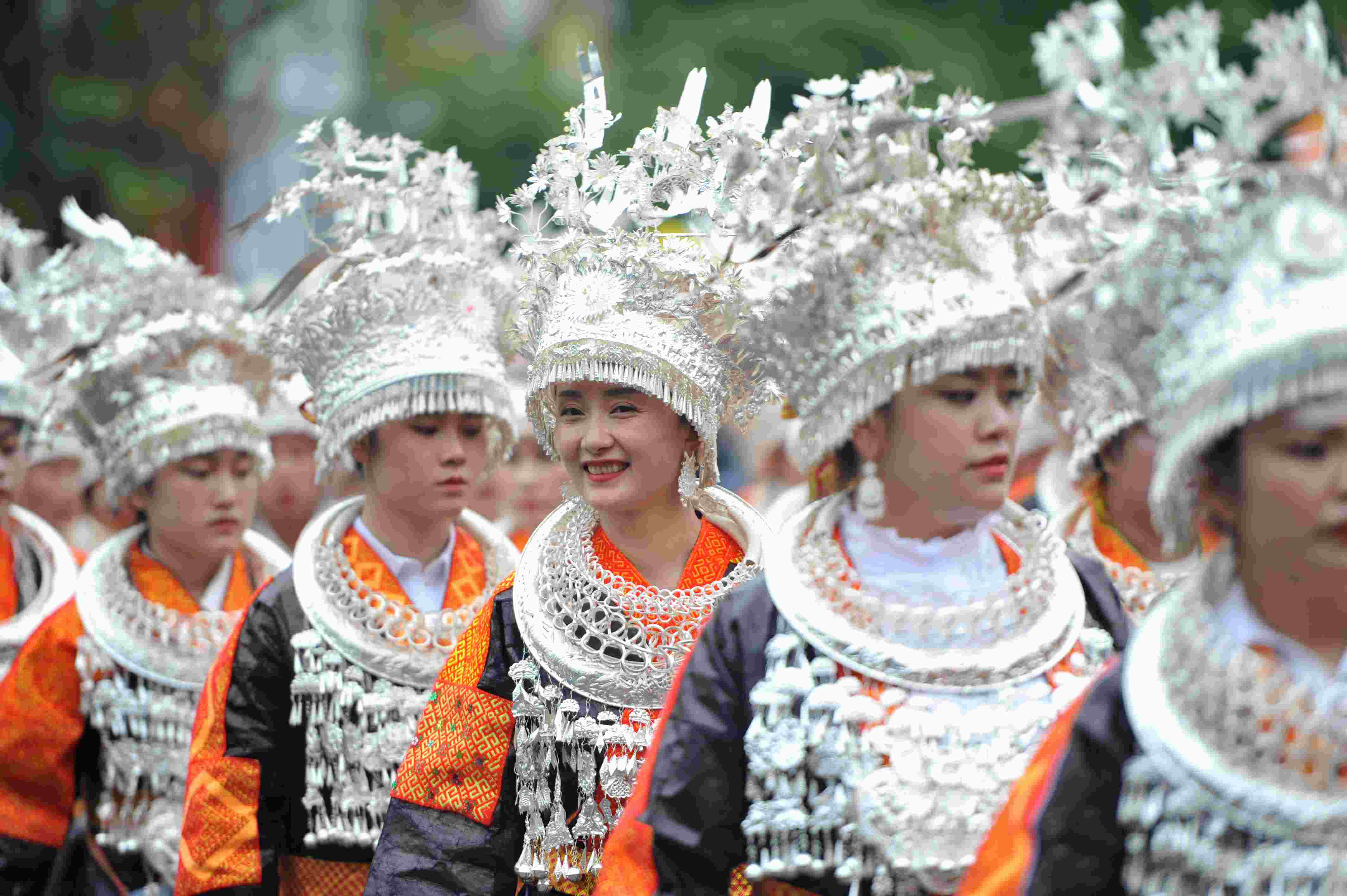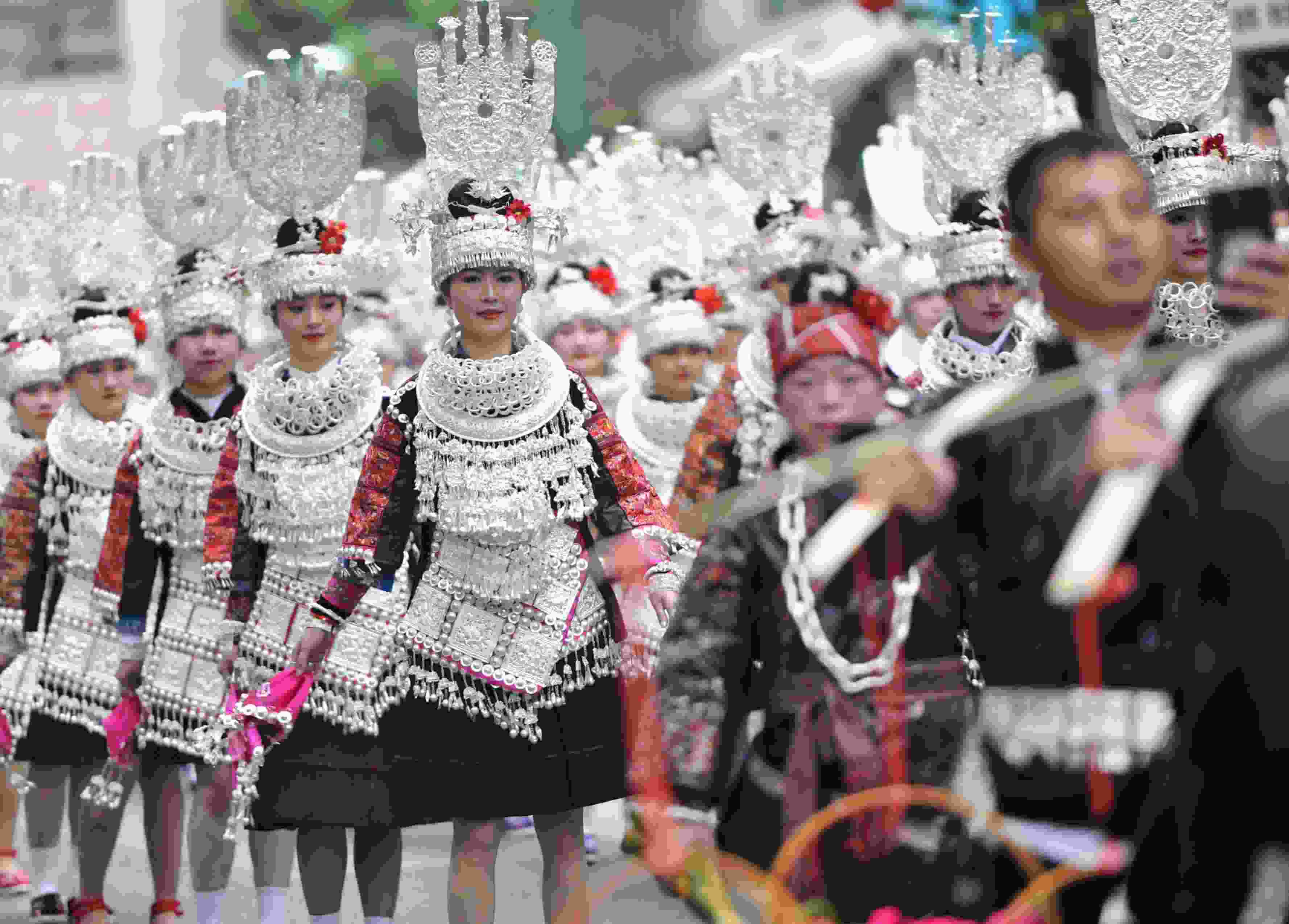 2023年5月2日,苗族同胞在參加“中國(guó)臺(tái)江2023苗族姊妹節(jié)”盛裝游演。