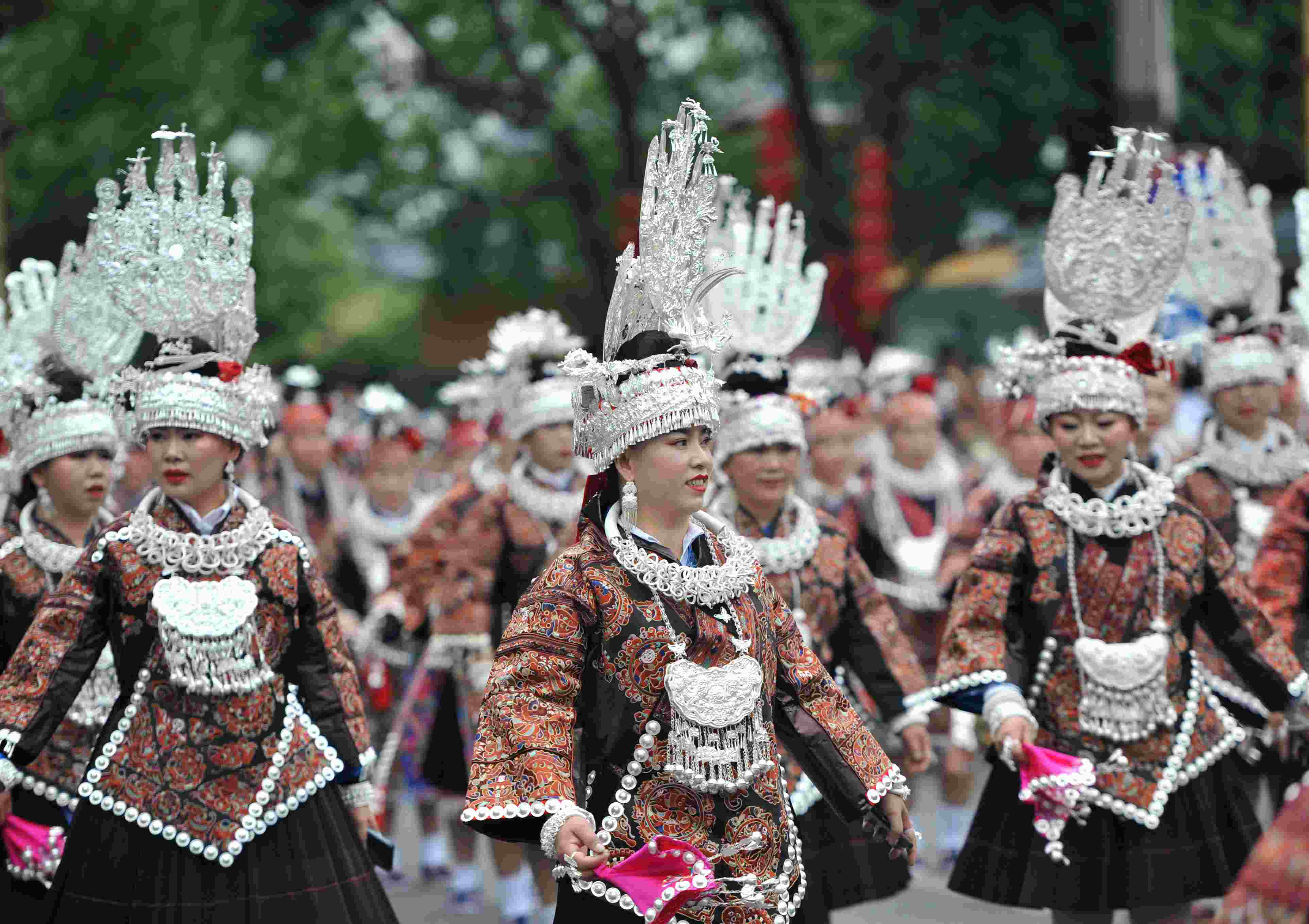 2023年5月2日,貴州省臺江縣,苗族女子盛裝參加“姊妹節(jié)”游演。