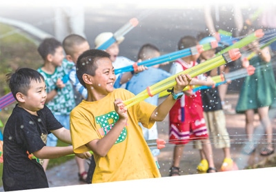 安徽省蕪湖市孫村鎮(zhèn)一家鄉(xiāng)村房車露營(yíng)地里,小朋友們?cè)陂_心地打水仗。肖本祥攝(人民視覺(jué))