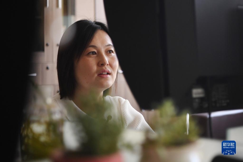 敦煌研究院文物數(shù)字化保護(hù)團(tuán)隊圖像處理人員年海麗從莫高窟照片墻前走過(4月25日攝)。