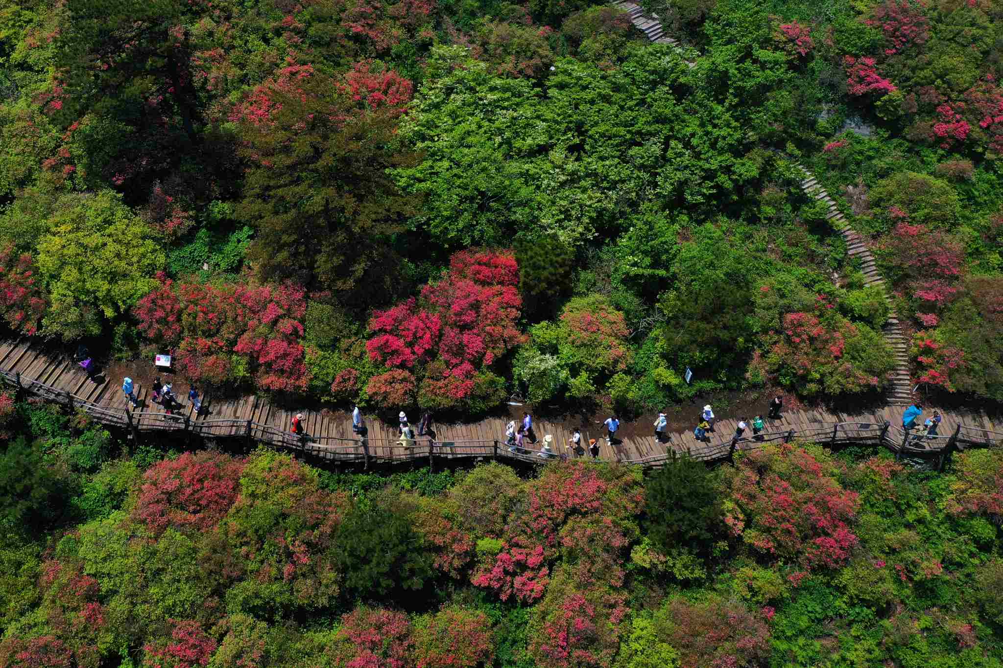 2023年5月5日,湖北黃岡,龜峰山杜鵑花綻放。視覺中國