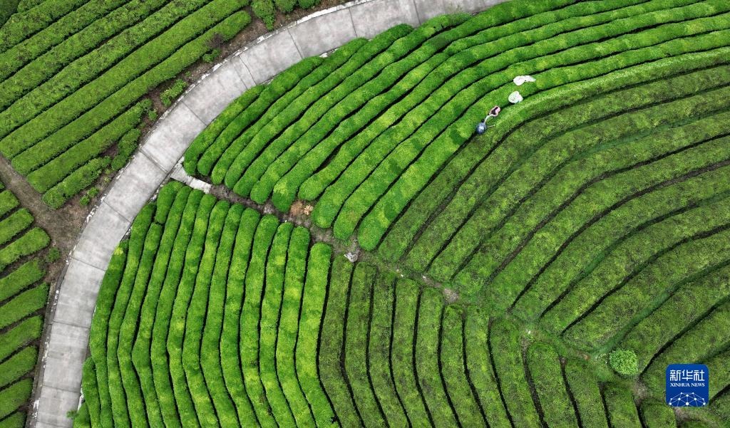 5月7日,茶農(nóng)在鶴峰縣走馬鎮(zhèn)楊柳池茶園采茶(無人機照片)。   新華社發(fā)(楊順丕攝)