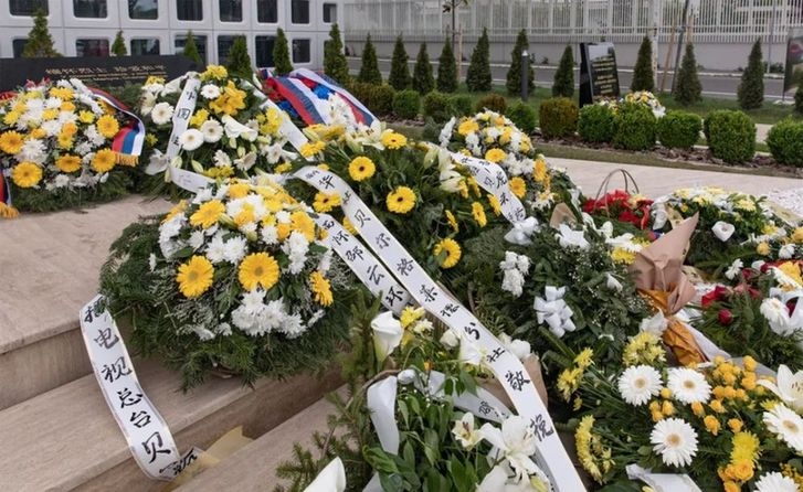 這是2022年5月7日在塞爾維亞貝爾格萊德的中國駐南斯拉夫聯(lián)盟大使館舊址紀(jì)念碑前拍攝的花圈。新華社發(fā)(王韡 攝)