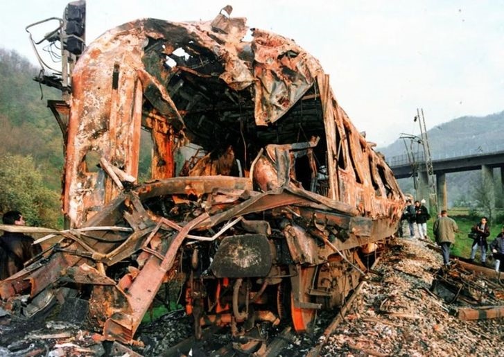 1999年3月24日,以美國為首的北約向南斯拉夫聯(lián)盟開始發(fā)動(dòng)大規(guī)??找u,武力干涉科索沃危機(jī)。資料照片顯示被北約飛機(jī)炸毀的火車。新華社發(fā)