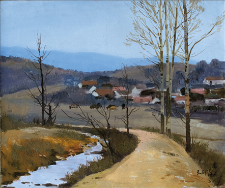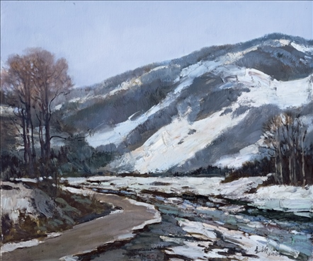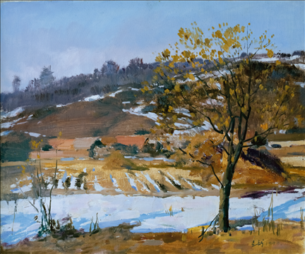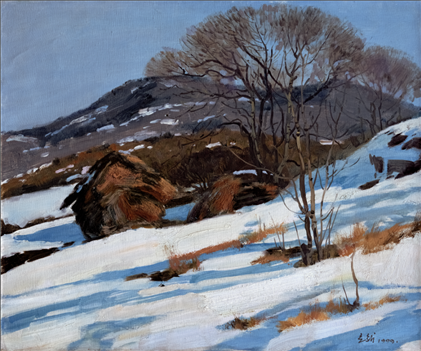 《激戰(zhàn)松骨峰》描繪的是抗美援朝戰(zhàn)爭中,中國人民志愿軍與美軍激烈廝殺的悲壯場面。作者從動(dòng)態(tài)型的構(gòu)圖與形象表層,把戰(zhàn)爭集團(tuán)之間的搏殺以濃重的筆調(diào)展現(xiàn)開來,表現(xiàn)了中國人民志愿軍英勇頑強(qiáng)、熱愛自由和勇于犧牲的精神,展示了歷史的悲劇性沖突。作者從沉甸甸的歷史中找到戰(zhàn)爭中最慘烈、最殘酷、最能表現(xiàn)人物悲劇性命運(yùn)的瞬間,用現(xiàn)實(shí)主義的創(chuàng)作手法,扎實(shí)、生動(dòng)地塑造了一個(gè)又一個(gè)志愿軍勇士的形象。硝煙籠罩著戰(zhàn)場,鮮血與白雪融合成冰,敵我雙方,犬牙交錯(cuò),生死搏殺。同時(shí),也使我們感受到戰(zhàn)爭的殘酷與生命的脆弱。作者處理宏大的戰(zhàn)爭場面獨(dú)具匠心:陽光透過硝煙,有節(jié)奏地營造出戰(zhàn)場的空間;雪地上被間隔的藍(lán)色陰影,反襯出黃褐色的主調(diào)。作品對細(xì)部進(jìn)行了恰如其分的刻畫,但又不失對整體宏觀的把握,厚重的色彩中透出熱情,樸拙的筆觸映著畫家的激動(dòng)。